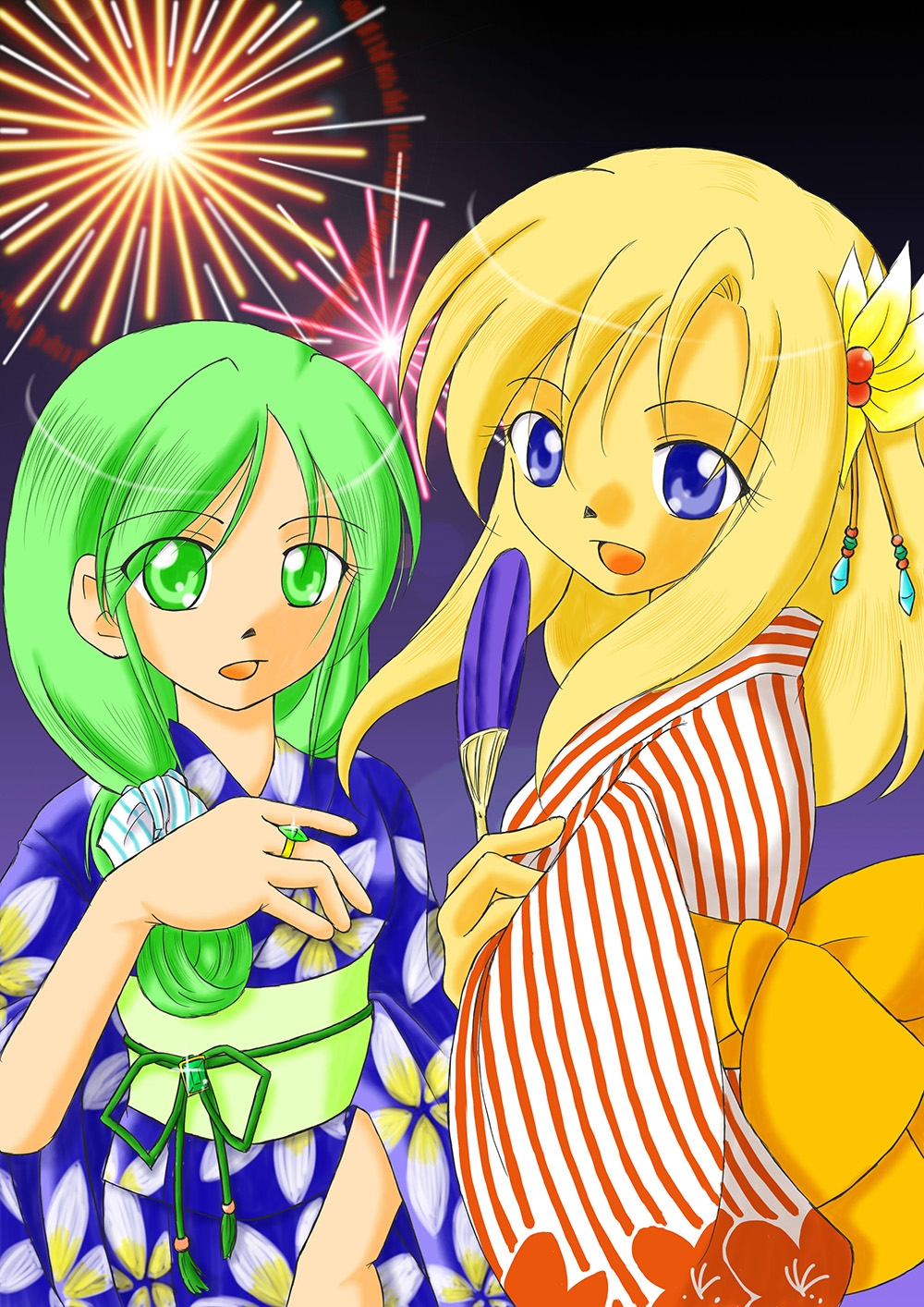 浴衣と花火 一次創作 2013.07.282025.09.28 the woRks original 25 看板絵。 当日頒布の本に出てくるヒロインということで、ウリルとエア。花火の描き方を一生懸命調べました。