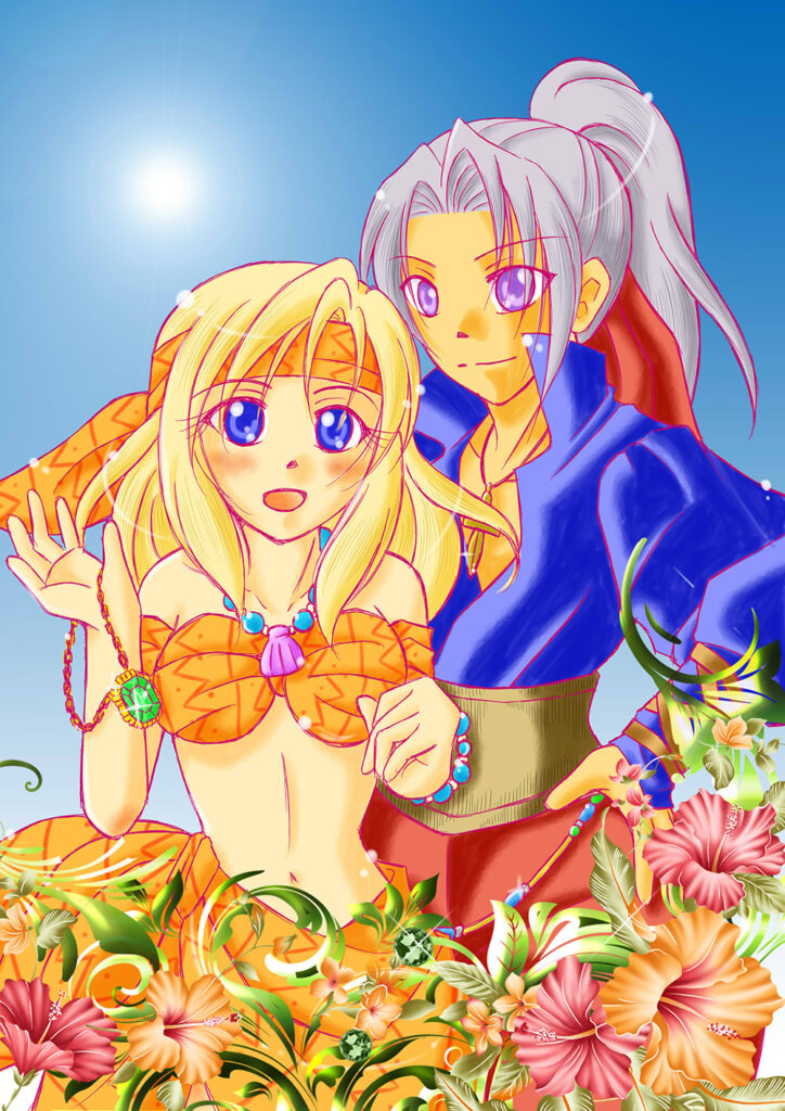 南の島でのお宝さがし 一次創作 2014.07.262025.09.28 the woRks original 28 看板絵。 海賊っぽいイメージで描いてみました。夢幻ちゃんはあまり露出したがらないので夏の絵は大変です。