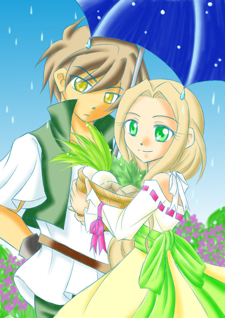 雨の日の収穫 一次創作 2017.06.102025.09.28 the woRks original 34 看板絵。 本編1文庫化記念に、本編1のゲストキャラクターになる二人を。ファンタジーのはずなのに、傘が普通という。