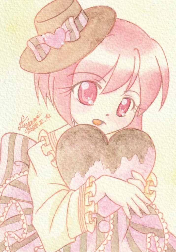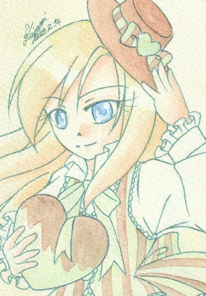 イチゴチョコな美琴ちゃんとチョコミントなウリルさん 一次創作 2024.11.042025.09.25 2020年に描いたらくがきのリメイク 使用用紙:ヴィフアール荒目使用画材:透明水彩、Juiceクラシックカラー